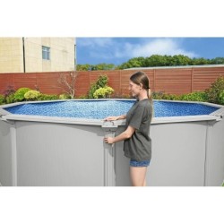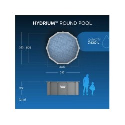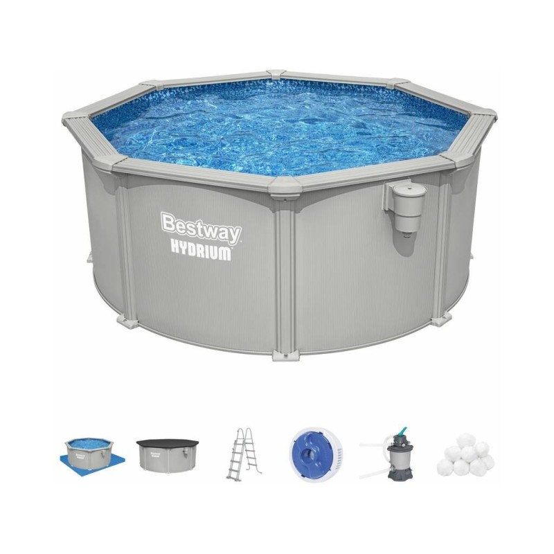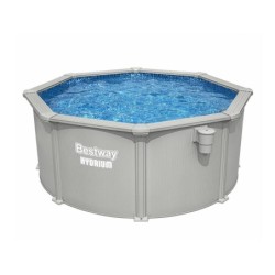 PISCINA BESTWAY HYDRIUM 56566 305 x 122 cm Fantástica para o seu terraço ou jardim. Grande resistência. Características: - Capacidade de 7.630 litros (aprox. a 90%) - Dimensões 305 x 122 cm (diâmetro x altura) - Espaço necessário com suportes: 350 x 350 cm - Tempo de instalação: 2 horas (aprox., com 2 ou 3 pessoas) - Borda superior em redor da piscina com 16 cm de largura - Pode permanecer montada durante todo o ano Inclui: - Liner tratado resistente aos raios UV - Filtro de areia de 3.596 L/h - Bolas de filtragem Polysphere para o filtro - Escada de segurança com 4 degraus - Dispensador Chemconnect - Tapete de chão - Cobertura - Skimmer